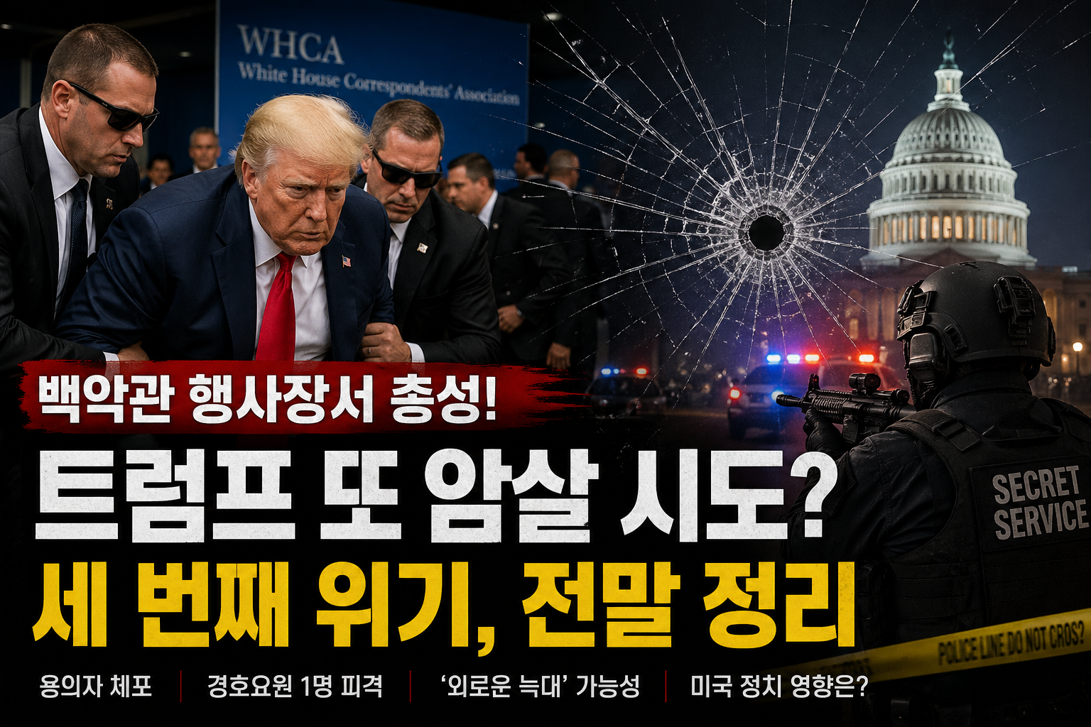미국 대통령 도널드 트럼프이 참석한 공식 행사장에서 총격 사건이 발생했다. 단순한 해프닝이 아니라, 세 번째 암살 시도로까지 해석되는 사건이다. 이번 사건은 단순 범죄인지, 아니면 미국 정치 불안의 신호인지 주목되고 있다.