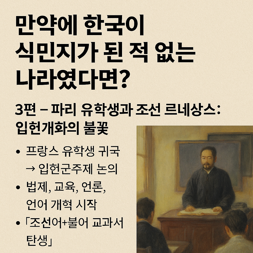 | 《만약에 한국이 식민지가 된 적 없는 나라였다면?》부제: 2편 – 청과 손잡은 일본, 프랑스의 조선 개입은 어디까지 가능했을까? (2) | 2025.07.21 |