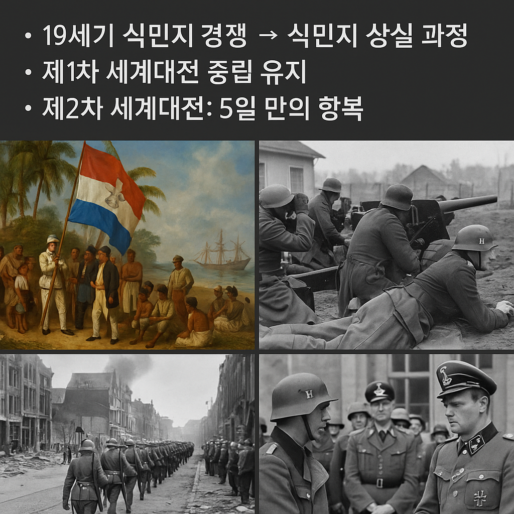 네덜란드는 철저히 중립을 고수했다. 직접 폭탄이 떨어지진 않았지만, 주변 국가들이 전쟁에 휘말리면서 무역 봉쇄가 발생했고, 식량난까지 겪었다. “중립이니까 우리는 안전하다”는 기대와 달리, 고립된 작은 국가가 겪는 취약성이 그대로 드러난 셈이다. - 제2차 세계대전 (1940)