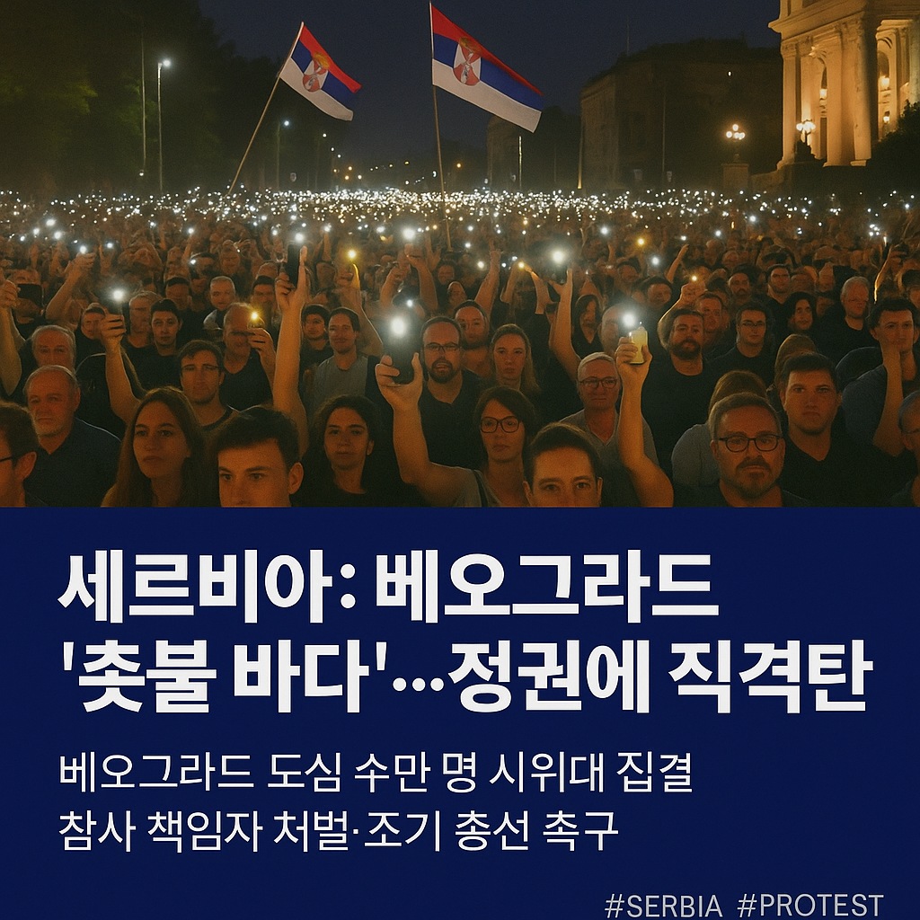 베오그라드 도심에 시민 수만 명이 모여 **휴대폰 플래시 켜고 촛불 든 ‘인간 파도’**를 만들었어. 주최 측 추산 참가자는 5만 명 이상. 학생들이 선두에 섰고, 철도역 지붕 붕괴 참사 책임자 사퇴·처벌을 강하게 요구. - 배경