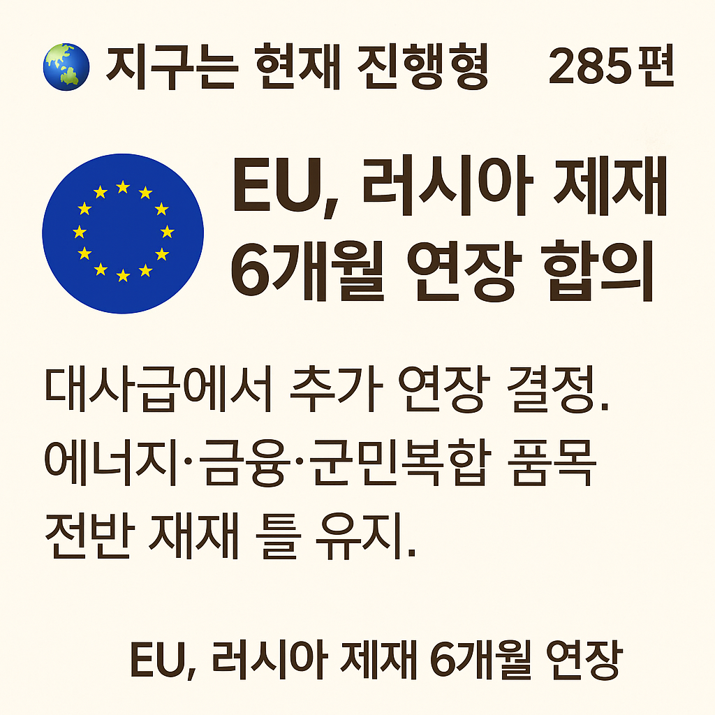 EU가 러시아 제재를 또 6개월 연장. 대사급 회의에서 만장일치로 통과됐고, 에너지·금융·군민복합(dual-use) 전반에 걸친 기존 틀 그대로 유지한다. 새 패키지라기보다 ‘프레임 고정 + 집행 강화’에 가깝다.