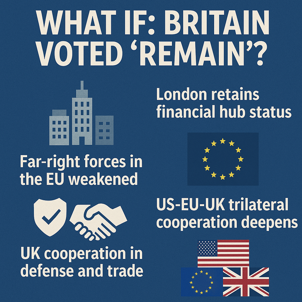 영국은 EU 잔류를 통해 미국·EU와의 3각 협력을 더욱 강화했을 것이다. 특히 러시아의 확장과 중국의 부상에 대응하는 과정에서, 영국은 서방 진영의 가교 역할을 유지했을 것이다. 이는 국제 질서에서 영국의 입지를 지켜주는 결정적 요소가 되었을 것이다.
