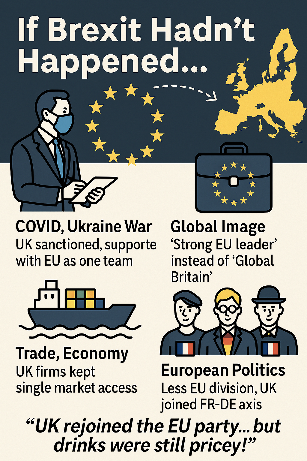 실제의 ‘글로벌 브리튼’은 고립된 독자 노선으로 평가받았다. 하지만 EU 잔류가 유지됐다면, 영국은 **“강력한 EU 리더 중 하나”**로 자리 잡았을 것이다. 이는 국제사회에서 영국의 발언권을 넓히고, 유럽 전체의 영향력 강화에도 기여했을 것이다.