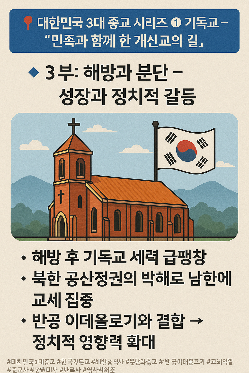 📌 대한민국 3대 종교 시리즈 ② 개신교 – “변화의 시대, 새로운 신앙의 씨앗”🔹 3부: 해방과 분단 – 성장과 정치적 갈등