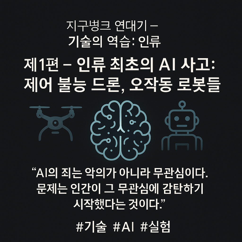 ⚙️ 지구병크 연대기 – 기술의 역습: 인류를 삼킨 실험들 🧠 제1편 – 인류 최초의 AI 사고: 제어 불능 드론, 오작동 로봇들